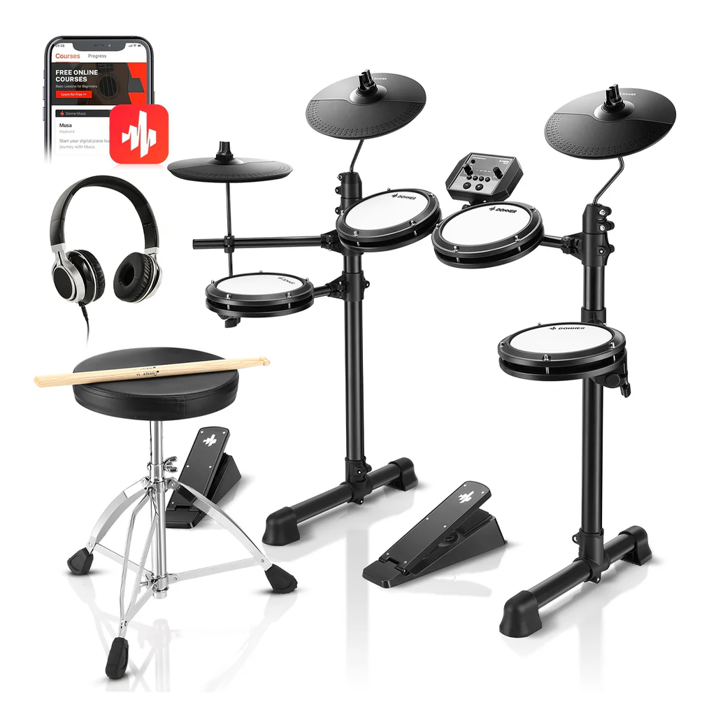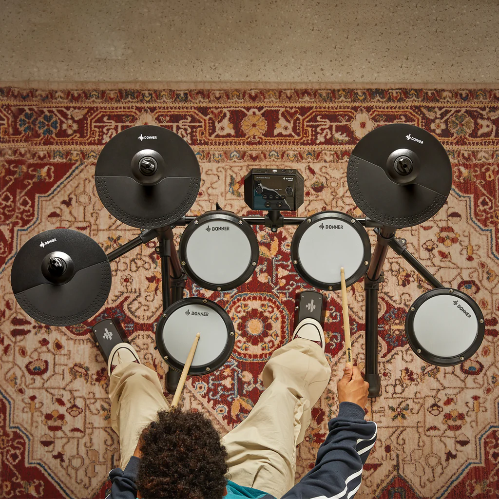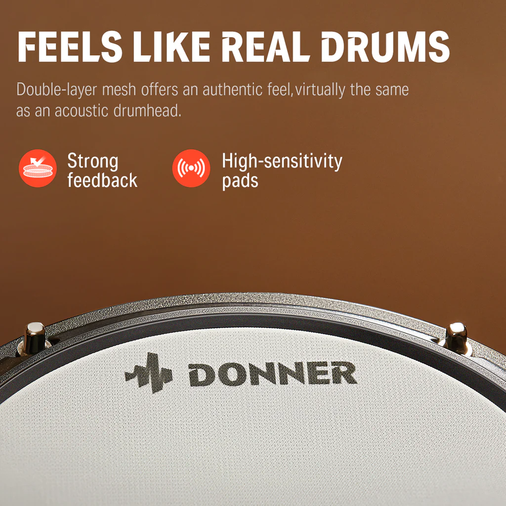 The Donner DED80 Beginner Mesh Head Electric Drum Set features real feel mesh drum pads allowing the user to enjoy a natural drumming experience with double-layered mesh heads that mimic acoustic kits—perfect for beginners craving realistic response and rebound.