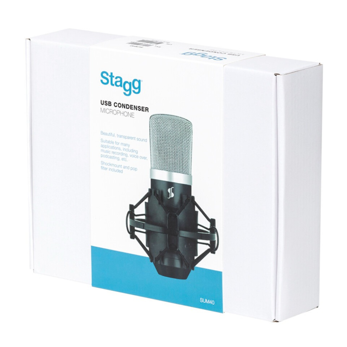 The Stagg SUM40 USB Condenser Microphone is a usb microphone used for music recording, Voice over and podcasting. It comes supplied with a USB B to USB A cable and suitable shock mount for microphone stands. It also features a headphone out for direct headphone use.