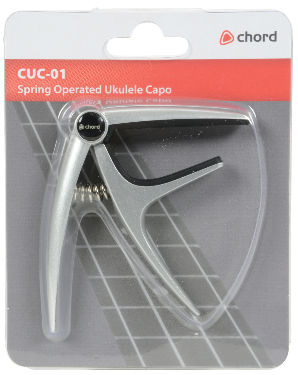The Chord Spring Operated Ukulele Capo is a quick release capo for ukuleles. Squeezing the 2 levers together releases grip on the neck, allowing easy removal or replacement and quick position change.