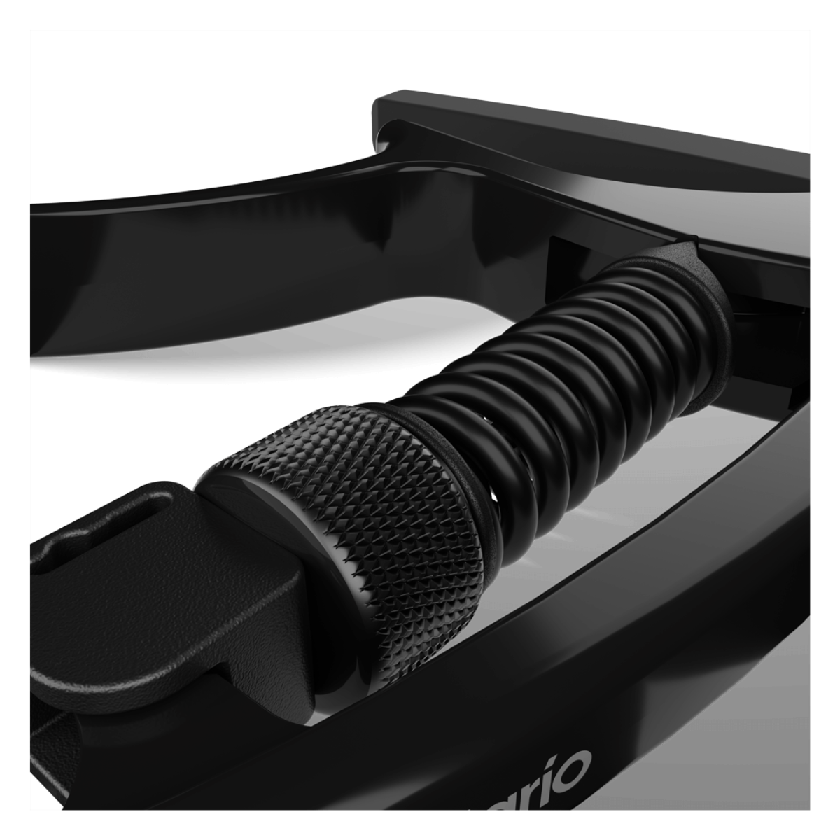 Tri-Action geometry reduces the force required to open and close the capo and applies even tension regardless of neck profile. The single hand, easy to operate Tri-Action Capo clamps to the headstock when not in use. An integrated pick holder stores your pick in a convenient location when playing fingerstyle.