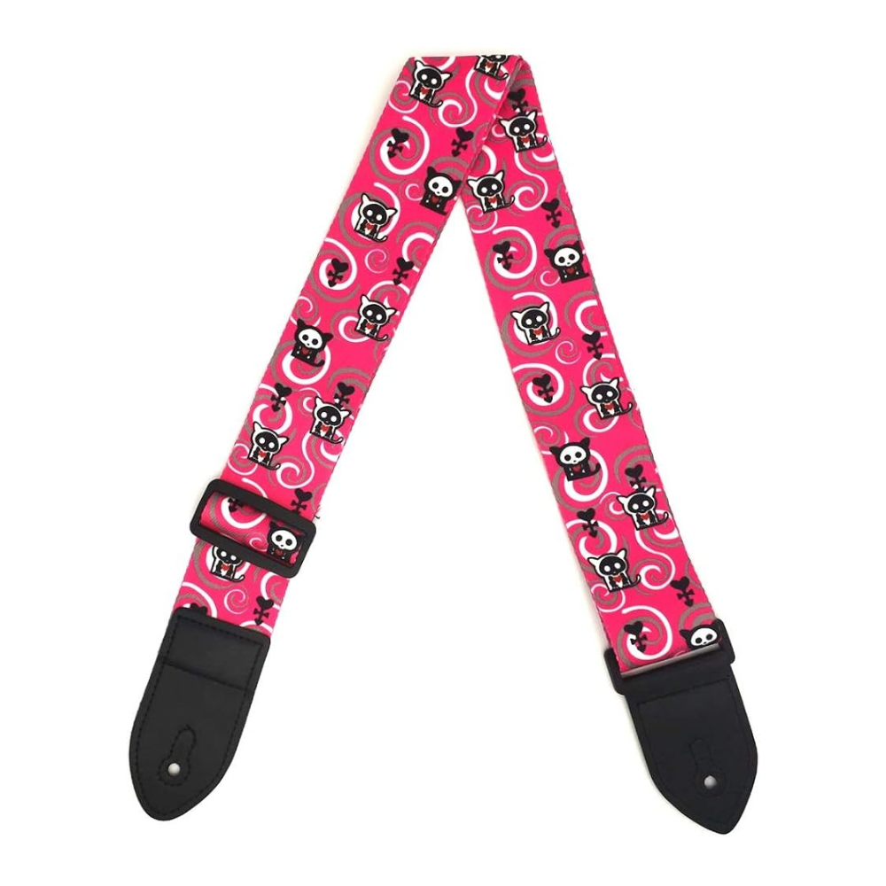 The Trax Guitar Strap Pink Cat is a guitar or instrument strap made with strong nylon webbing material, PU leather fobs and plastic slide buckle for length adjustment. Each strap is printed with a themed design. This strap features a pink cat design.