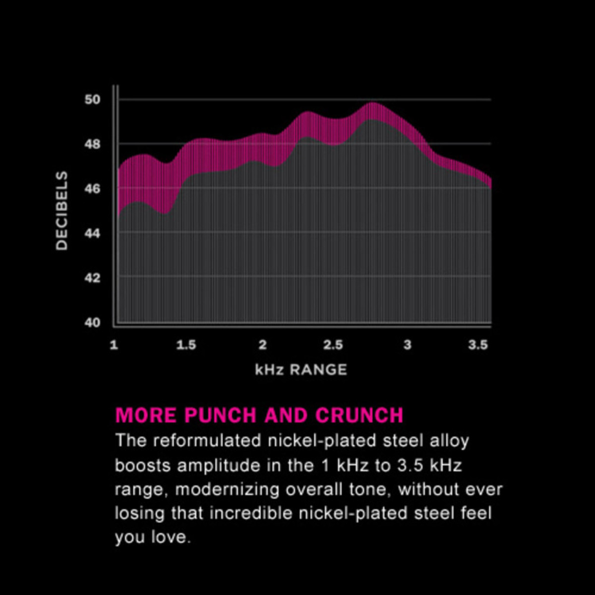- The premium nickel-plated steel wrap wire used for NYXLs provides accentuated frequency response in the 1 – 3.5 kHz range, so you get more presence and crunch to cut through the mix.